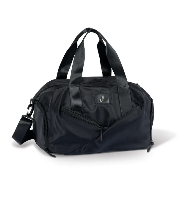 This amazing utility dancer duffle has it all. Roomy fully lined inside compartment in addition to a separate side entry pocket for shoes or wet items. Two additional front exterior pockets make organizing your dance gear a snap! Soft double carrying handles along with an adjustable shoulder strap and the word Dance engraved on the front and back strap completes this bag. Wipes clean and folds flat.Â