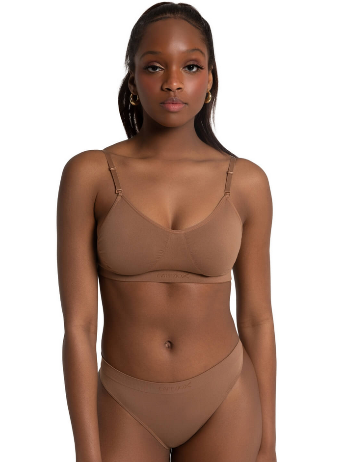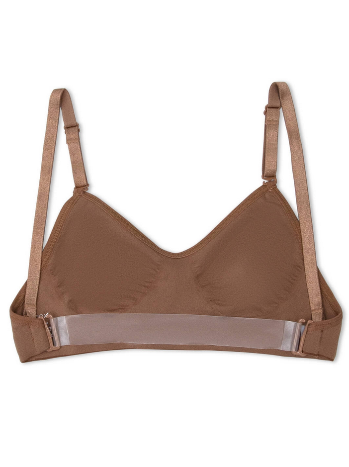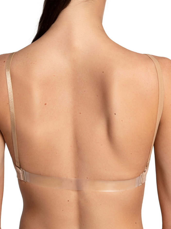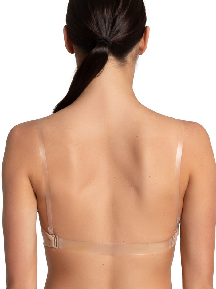 Slip on our best-selling Clear Back Bra for seamless support under active wear. Features a detachable, clear back strap that will avoid outfit clashing under leotards and costumes. Made of a nylon and spandex blend that is soft and moisture-wicking. The anatomical contouring adds shape and creates a smooth profile under layers. Available in adult sizes only.
