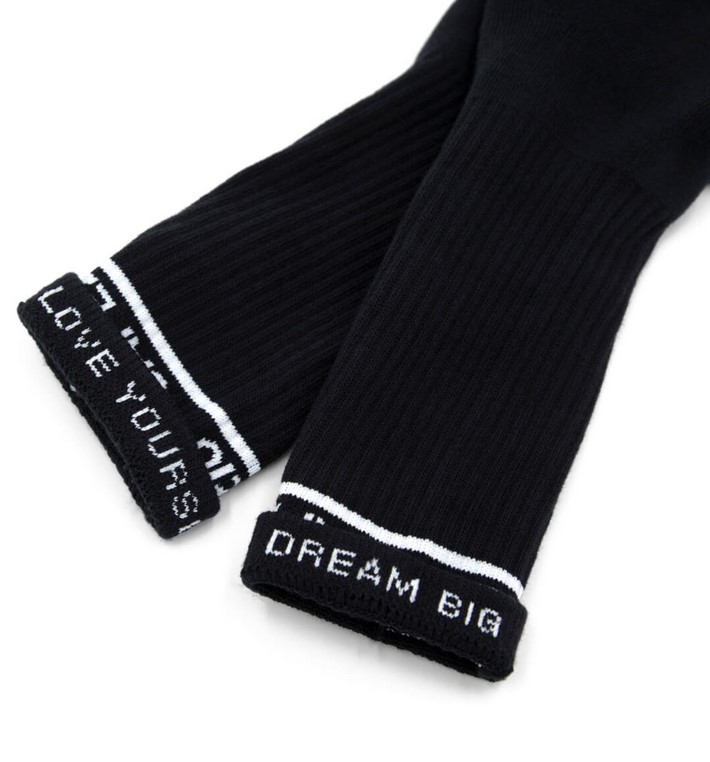 - Inside of the socks says “LOVE YOURSELF” and “DREAM BIG”