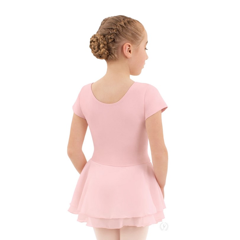 This short sleeve, Cotton Lycra® dance dress features a modest scoop neck, scoop back, and attached double layer chiffon skirt. Eurotard’s blend of Cotton Lycra® is the highest quality available on the market with its soft, supple feel and thick, premium weight quality. This short sleeve dance dress is complete with Eurotard’s signature full front lining that wicks away moisture, controls odor, and provides extra coverage.