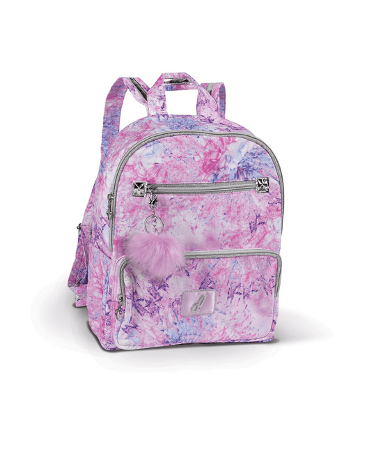 Beautiful tie-dye print backpack features four outside pockets, two front zippers and two side. Silver piping trim plus a matching poof keychain bring this bag to life! Adjustable back straps and hanging strap complete this groovy functional bag. This bag wipes clean and folds flat.