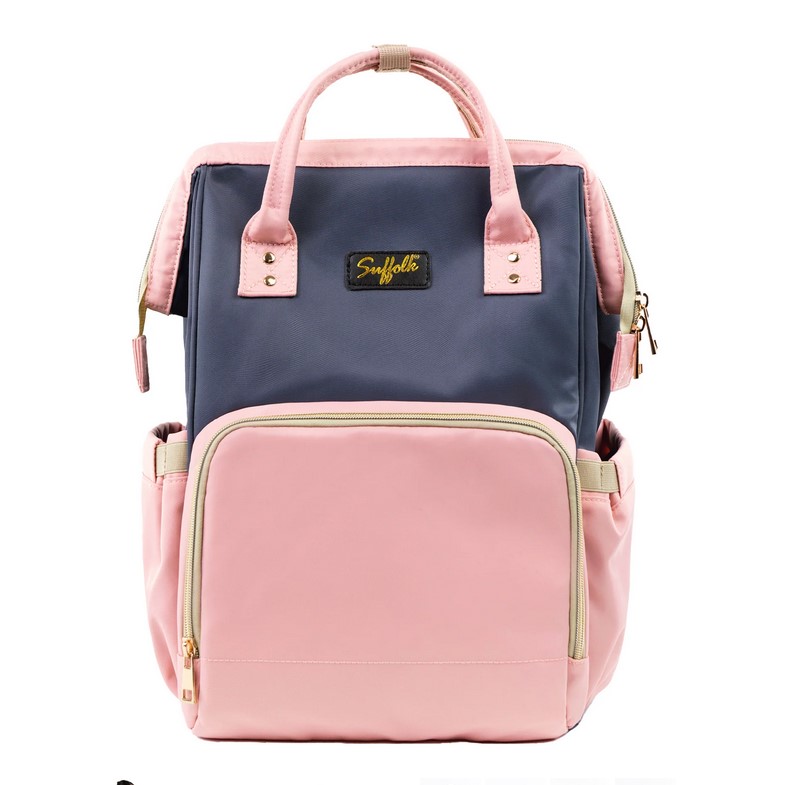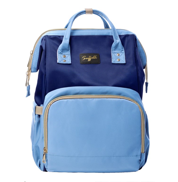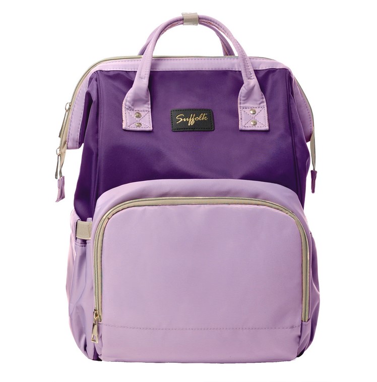 - On the outside of the bag, the front features a large, zippered compartment that contains an insulated snack pocket