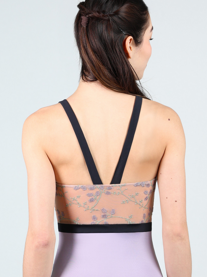 Pinch front thick strap leotard with embroidered mesh overlay.