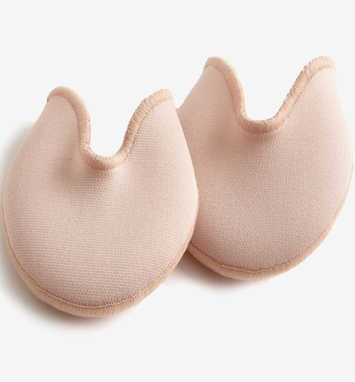 - Crescent shaped pad with a thin layer of gel material inside a fabric pouch