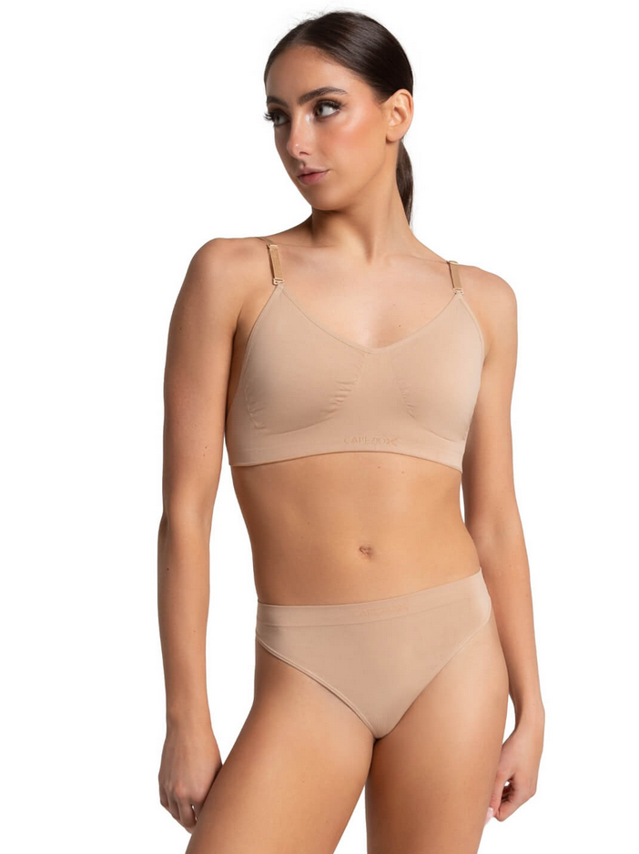 Slip on our best-selling Clear Back Bra for seamless support under active wear. Features a detachable, clear back strap that will avoid outfit clashing under leotards and costumes. Made of a nylon and spandex blend that is soft and moisture-wicking. The anatomical contouring adds shape and creates a smooth profile under layers. Available in adult sizes only.