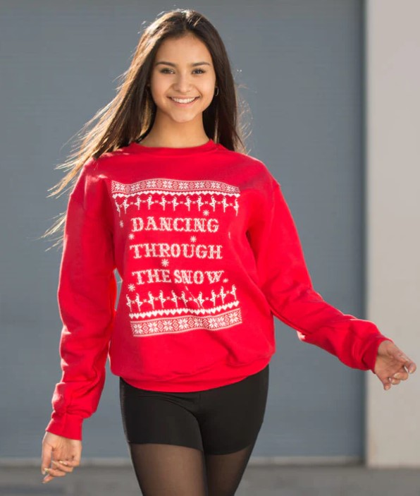 You’ll be “dashing through the snow” to dance class this year and we have just the right crewneck sweatshirt to keep your core warm!