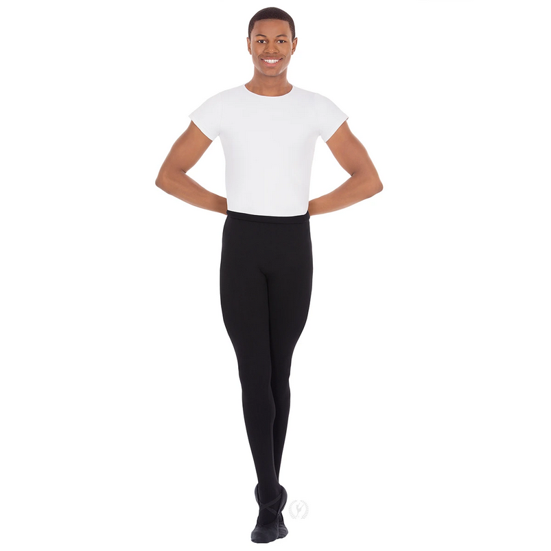 Opaque, supple, matte microfiber mens footed tights with a specialized, wide woven waistband for support. The full footed design wraps snugly around the foot for a smooth, secure fit in jazz or ballet shoes. EuroSkins tights hold their shape, elasticity, and color, even after hours of wear and repeated washings. The only seam is the inseam, making this style ideal for men.