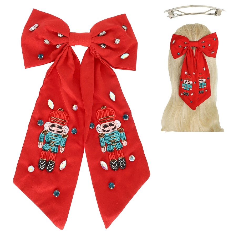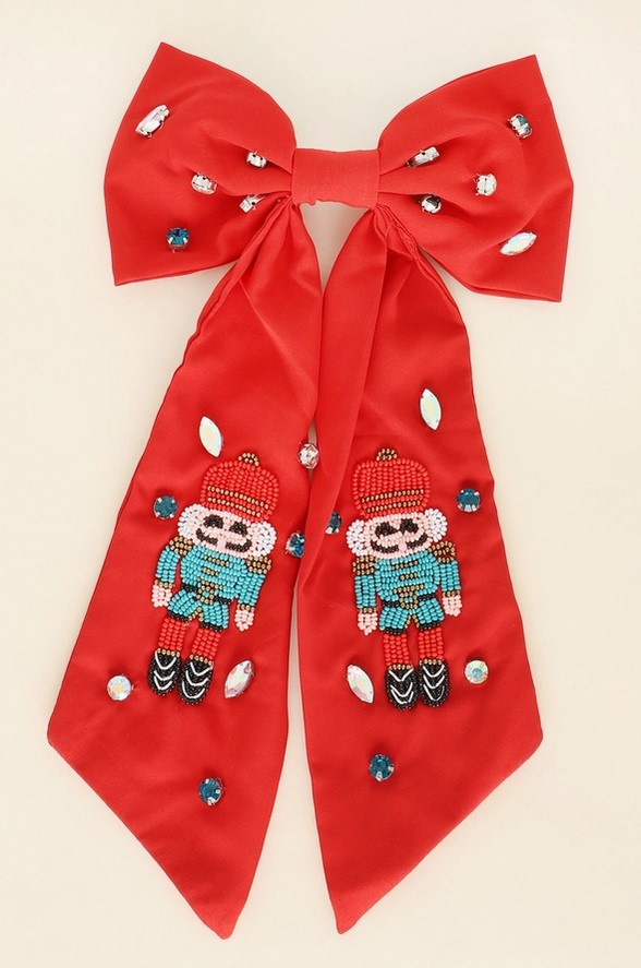 Expertly crafted with intricate beadwork, the Nutcracker Bead Embroidered Bow Barrette Hair Clip is a perfect addition to any holiday ensemble. Its delicate design adds a touch of elegance, while the sturdy clip ensures a secure hold all day long. Enhance your hairstyle with this unique and festive accessory.