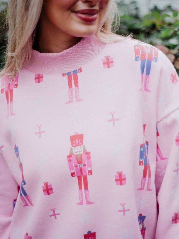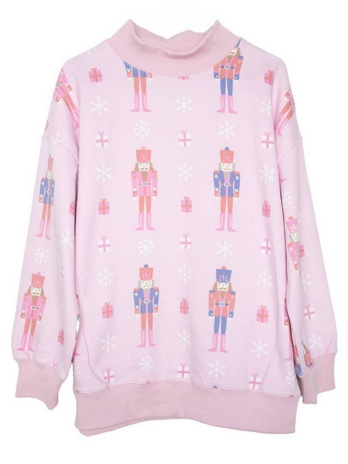 March into holiday season style with the cutest holiday sweatshirt. This Nutcrackers Printed oversized sweatshirt is cozy, festive, and fun. Featuring a festive nutcracker print in soft holiday hues, it delivers major Christmas morning vibes with a girly twist.