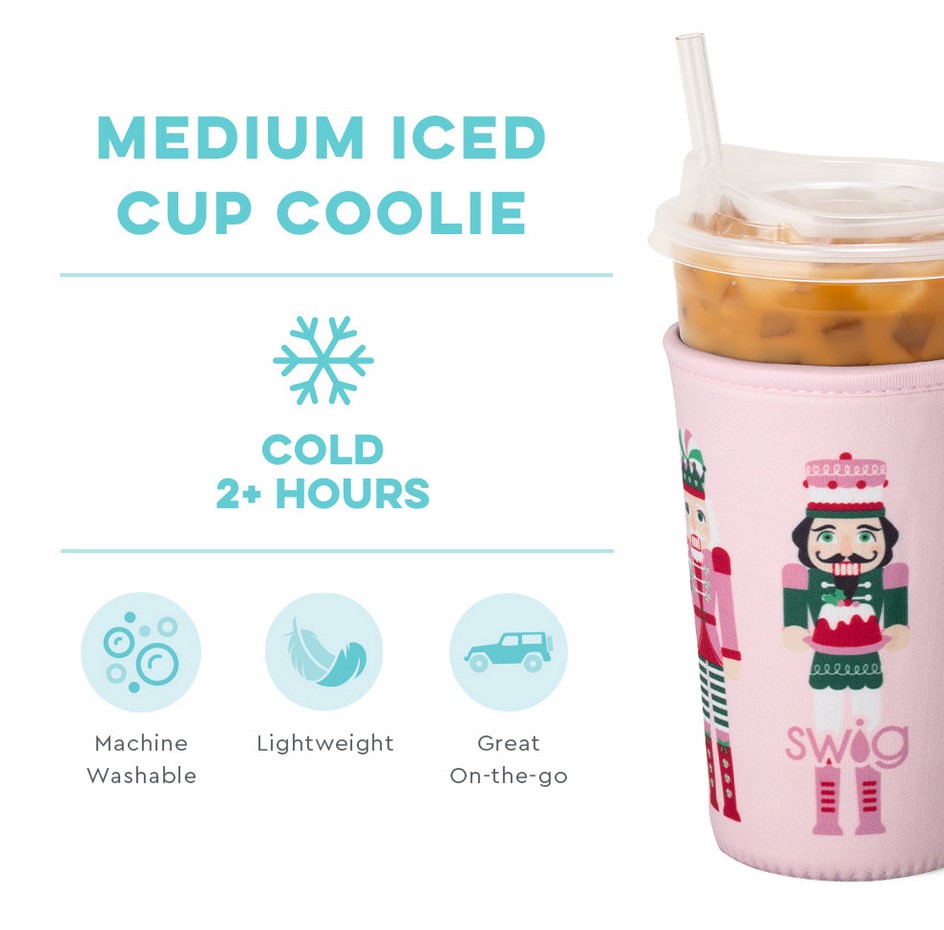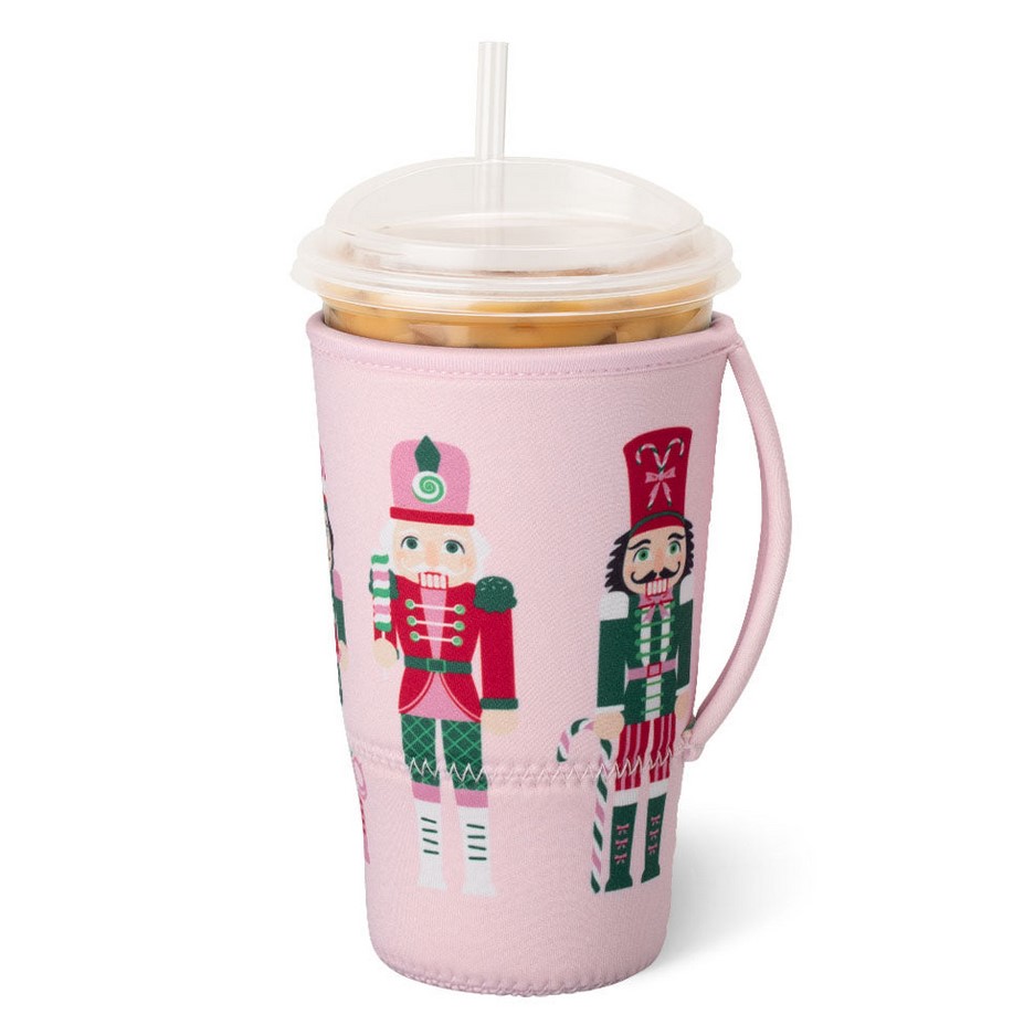 Cool drinks, dry hands! 🧊☕ Festive toy soldiers dressed with peppermints and holiday candy march around a pale pink background.