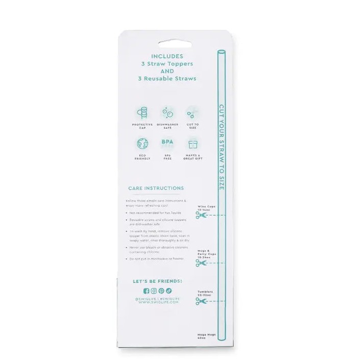 Compatible with all Swig tumblers and fits most other standard drinkware brands. Straws can be cut to size using the diagram featured on the back of the packaging. Pull gently when removing the protective cap to avoid damage.